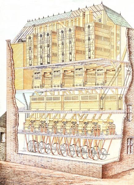 Westminster Bridge Mill, 1885, showing the arrangement of the roller mill with different sets of machinery on each floor