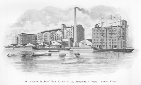 | The roller mill at the turn of the century is perhaps epitomised by Vernon & Sons’ mill at Birkenhead, Liverpool which opened in 1899. Built on the latest Simon system, the mill had two separate milling plants, one with nine 60 inch and twenty-seven 40 inch rolls, the other with nine 60 inch and thirty-five 40 inch rolls. The number of dressing and purifying machines ran to several hundred. The mill’s cleaning department had four complete sets of machinery for separating, washing and drying the wheat prior to grinding. The mill, which also had electric lighting and sprinkler systems, was powered by a 1200 horsepower steam engine and was capable of producing some 70 sacks per hour. As Bennett and Elton commented, the efficiency and capability of the plant was well-demonstrated in its prize-winning, aptly named ‘Millennium’ flour. | |
