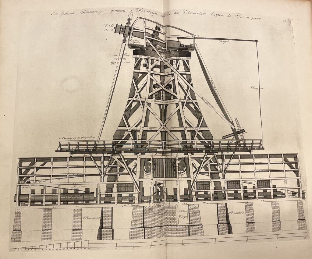 This large folio-sized book was produced as a reference book for millwrights and mill owners in the Netherlands. The book’s focus was on the mills that were located in Amsterdam. Johannis van Zyl was a mill maker (the literal translation of the word moolenmaker which features on the first page) from Lexmond, near Utrecht. Jan Schenk was the individual who engraved van Zyl’s drawings onto copper plate so they could be printed in the text. It is thought that Jan was a relative of the publisher of the piece, Petrus Schenk.