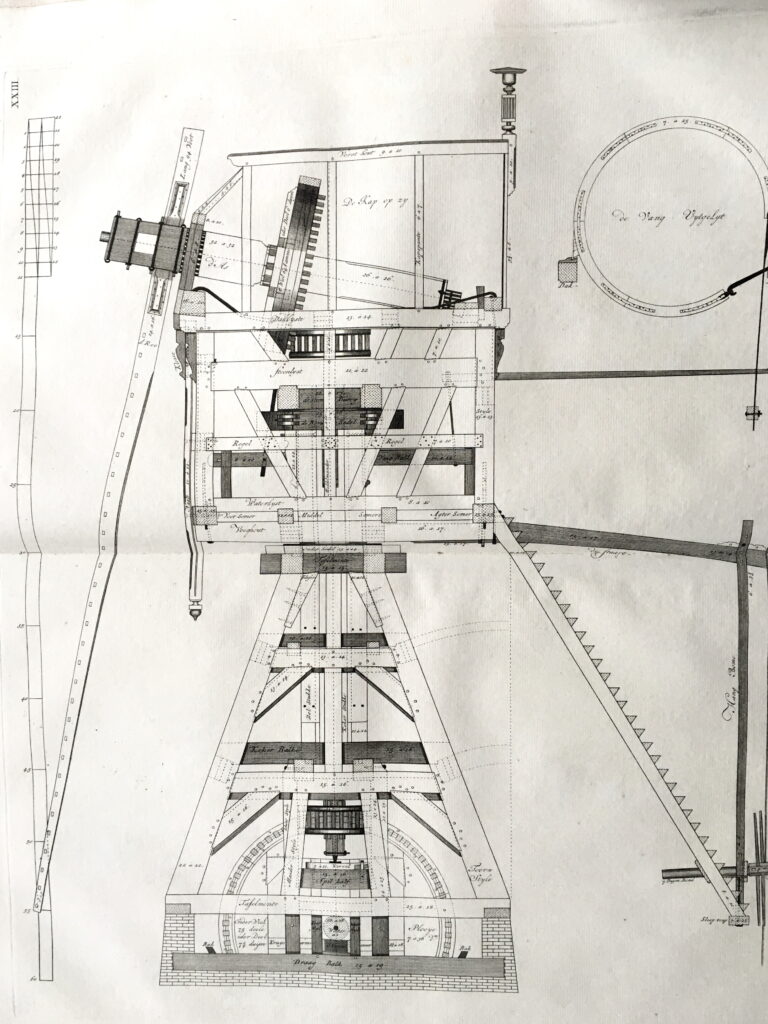 In the same year, another text similar to van Zyl’s appeared on the market. It was called the Groot Volkomen Moolenboek, which translates to the Big Perfect Mill Book, and was produced by Leendert van Natrus, Jacob Polly and Cornelius van Vuuren. We also hold a copy of this moolenboek at the archive. Both of the texts show how meticulous and detailed the craft of mill making, or millwrighting, was in the early 18th century. Prior to this, mill makers would work from experience and all mills were crafted differently and therefore the knowledge they had was unlikely to be put on paper. In addition, the craft of mill-making was very lucrative in the Netherlands in this period, and therefore mill-makers and their bosses had a vested interest in keeping the process of building wind- and watermills from being widely documented. This text sought to put an end to that, and portray the process of building a mill accurately and clearly.