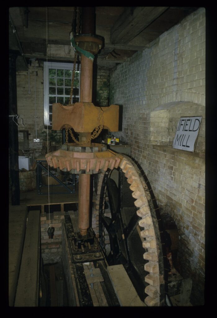 This shows a pit wheel with wooden teeth working with an iron wallower – this displays how wooden and iron parts of the mill could work in tangent https://catalogue.millsarchive.org/interior-ifield-mill-crawley