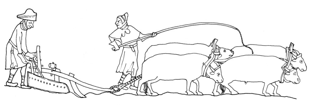 | Bread continued to be a staple food throughout the Middle Ages. In rural areas most households baked their own bread. This was probably usually under a pot on a hearthstone but some small rural cottages, such those excavated at Hangleton on the Sussex Downs and Tresmorn in north Cornwall, had their own ovens. The floor of the oven in the cottage at Tresmorn was a granite rotary quernstone – a not uncommon reuse. Monasteries, castles and manor houses also had their own bakehouses and ovens. In towns and cities, however, commercial bakers were gradually increasing in number; there were at least six operating in Winchester by about 1100. Like millers, bakers appear generally to have had a bad reputation. This was perhaps not undeserved for in 1266 an Assize of Bread was decreed by royal order. This standardised the weights and prices of bread and grain and was intended to stop or at least reduce the practice of selling under-weight bread, and to keep prices down and curb undercutting and racketeering between the bakers’ guilds. A number of medieval manuscripts depict baking, showing scenes such as kneading the dough in a trough and taking small round loaves from the oven with a wooden peel. Similarly, the production of small white loaves is depicted in the series of illustrations from the Ordinances of the York Baker’s Company, 1598, and an oven, kneading trough and peel are also featured amongst the bakers’ tools in Randle Hoolme’s Academy of Armory, 1688. Indeed, the method of baking bread in wood-fired domed clay ovens was to remain virtually unchanged until the introduction of steam ovens in the 19th century. As in earlier periods, there were several different types of bread. Pandemain was the finest, made from wheat flour sifted two or three times; loaves of white bread are shown on the table at which the family and guests are being served a meal in one of the scenes of everyday life depicted in the 14th century Luttrell Psalter. At the other end of the scale was maslin, a mixture of wheat and rye, and horse bread which included peasemeal and ground beans. The carbonised remains of small round loaves which had been made from a mixture of wheat and rye were found during the excavation of a house in Ipswich which was destroyed by fire in the 11th century. Tourte or brown bread, wholemeal mixed with rye or barley flour, was used for trenchers (from the Norman French tranchoire, meaning slice) at wealthy tables, used to soak up the gravy and juices from pieces of meat. The trenchers were not usually eaten as part of the meal but given to servants, dogs and the poor at the gates afterwards. Gerald of Wales in his Description of Wales, written about 1188 says that ‘sometimes they (the Welsh) serve the main dish on bread, rolled out large and thin, and baked fresh each day’. Monastic accounts indicate that different grades of white and brown bread were produced in the abbey bake-houses; the best quality for the abbot and his guests, the poorest quality for the abbey servants. | |