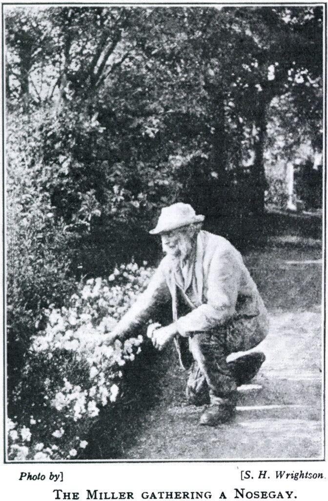 | Alfred had many hobbies, but his garden was his chief concern: “no roses were more plentiful or sweeter than those which grew in his front garden”. When he grew old and walking became impossible, he invented a cycle for himself in which to get around the garden. There are several photos to hand of the miller working in his garden, for example him “gathering a nosegay”. | |