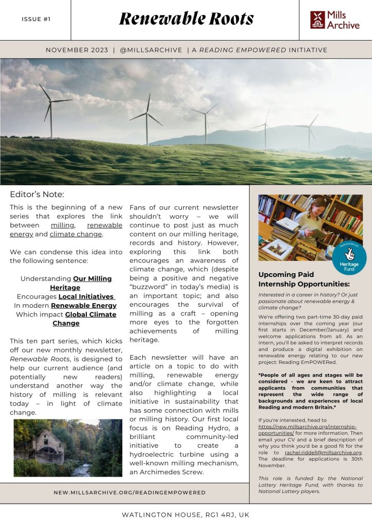 Each newsletter will focus on a topic to do with milling, renewable energy and/or climate change, while also highlighting a local initiative in sustainability that has some connection with mills or milling history.