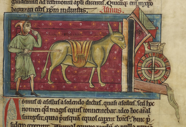 | The Rochester Bestiary is an English manuscript produced around 1230 to 1240, likely in Salisbury. It is part of the bestiary tradition, a genre that blends natural history, Christian symbolism, and moral instruction. The manuscript contains vivid descriptions of real and mythical animals, each accompanied by allegorical interpretations meant to convey moral or theological lessons. Animals like lions, elephants, donkeys, and even fantastical creatures such as unicorn and griffins are depicted with colourful miniatures and paired with Latin text that explains their supposed behaviours and spiritual meanings. This illustration depicts a man coaxing a donkey with a stick and whistle, guiding it toward a waterwheel. It is a rare vignette showcasing the use of watermills during the medieval era for grinding grains. The donkey is likely being used to transport the grain to the mill. Source: Bestiary. England, 1230-1240. British Library, Harley 4751, f.25 You can view the rest of Nyah’s exhibition here: |
