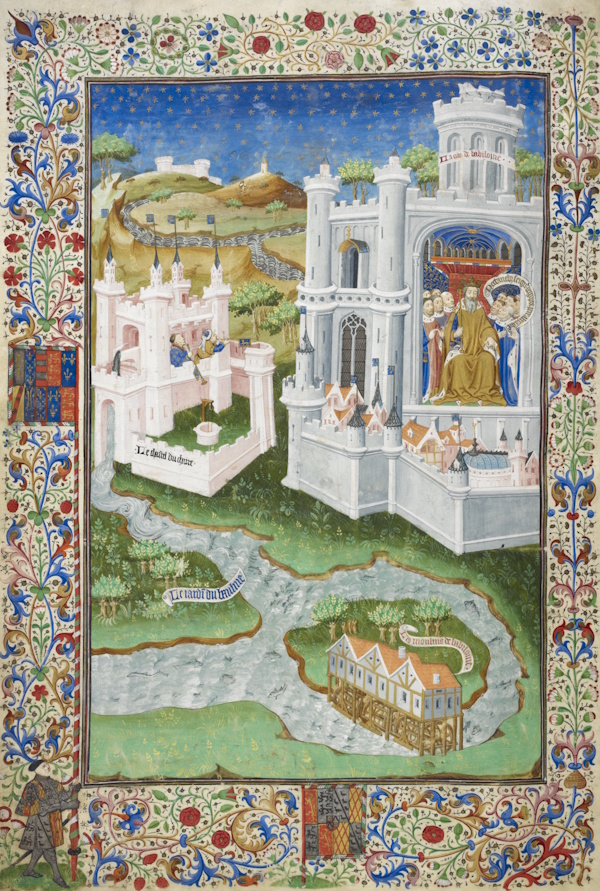 | The Talbot Shewsbury Book was a manuscript created in Rouen, Normandy around 1444-45. This volume was produced for John Talbot, Earl of Shrewsbury, and gifted to Margaret of Anjou upon her betrothal to King Henry VI. It compiles fifteen French texts including poems, romances, and treaties on warfare and chivalry. The extract above embodies the Battle of Heroes and Lovers aesthetic, typical of mid-15th century Rouen workshops, rich in detail and symbolism. This illumination helps set the scene for the epic narrative that follows, merging literary content with high artistry. The bottom right of the illustration depicts a watermill, referred to as the “Mills of Babylon,” offering a rare glimpse of medieval milling machinery in action. With its clearly depicted waterwheel and architectural structure, the scene provides valuable insight into how such mills functioned within both the practical and symbolic landscapes of the Middle Ages. While serving a decorative purpose within the manuscript, the image also reflects a broader interest in engineering and everyday life, making it one of the few visual records of milling machinery from the period. Source: Poems and Romances (the ‘Talbot Shrewsbury Book). France, 1444-1445. British Library, Royal 15 E. VI |