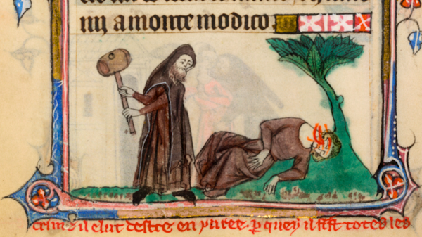 | These images are from a medieval illuminated manuscript, specifically the Taymouth Hours following the Use of Sarum – a popular Latin rite in England in the Middle Ages. The images show decorated marginalia, which are illustrations in the borders that often told moral tales, included humour, or illustrated religious lessons. These particular marginalia are often unrelated to the main religious text and can be quite whimsical or satirical. These particular marginalia illustrate the story of ‘The Sinful Hermit’. The story is as follows: |