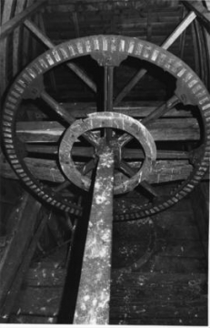 Bin floor of post mill, looking down on windshaft, tailwheel and machine drive pulley