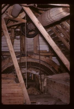 Showing bins, brakewheel and sack hoist.