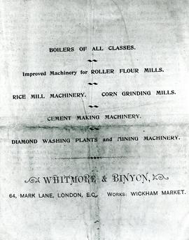 Copy by PD of a photograph of an advertisement for Boilers of all classes and improved machinery for roller flour mills, made by Whitmore and Binyon.