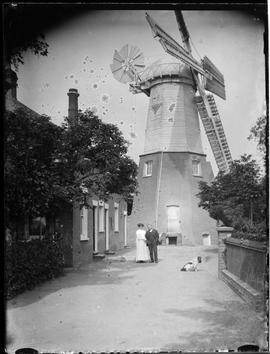 Black and white image of Chesterton Mill viewed from the front of the Mill House with Edwin and Edith French with their dog, Major. The Mill Office and Granary are on the left.