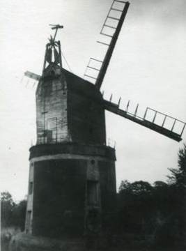 Photograph of Little Laver windmill in Essex. The photograph shows the post mill with a huge roundhouse. Photographed in 1945 by Len Chapman and passed to Kenneth G. Farries in December 1953.