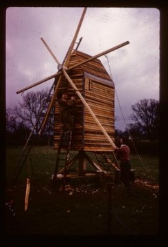 Rodney de Little constructing his model post mill with six sails and (at present) open trestle, helped by unknown man.