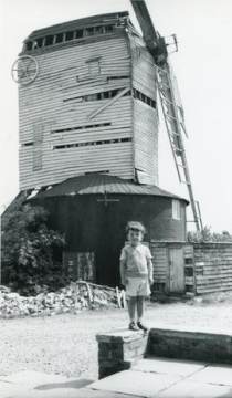 Photograph showing a child (Possibly one of KGF’s children or a child related to the Hoad Family at Bexhill) standing in front of the derelict post mill at Down’s Mill (also known as Hoad’s Mill) in Bexhill, East Sussex. Photographed by Kenneth G. Farries
