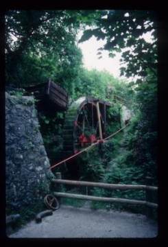 Exterior view of preserved standalone(?) Waterwheel driving linear shaft