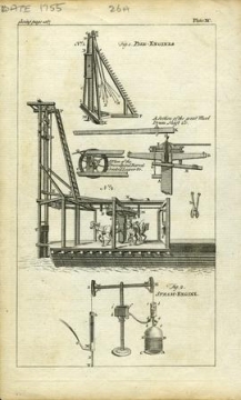 Illustration page from an encyclopaedia dated 1755 showing 3 horses turning a pile engine.