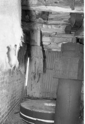King’s Bromley Flour Mill, King’s Bromley – first floor, top of upright shaft and a pair of millstones, seen through a window in the front of the mill