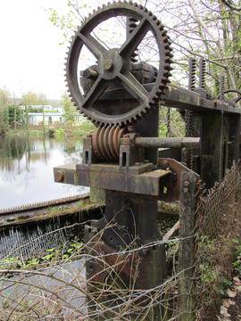 Victoria Mill, Dartford, downstream view with boys on bridge