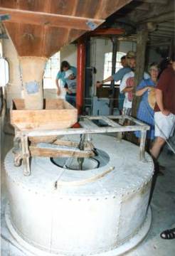 Photograph of one of the milllstones with machinery and people at Layham watermill. Photographed by Peter Dolman.