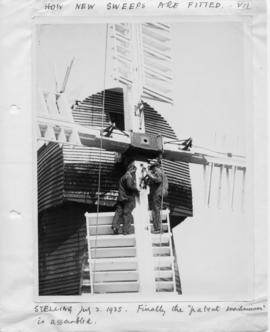 Part of Billings’ unpublished manuscript. Photograph of Stelling windmill. Part 5 of a series of 5 showing new sweeps being fixed. Annotated “2 July 1935. Finally the “patent mechanism” is assembled. Shows a close-up of the sweeps and two men standing on them.