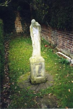 Photograph of a millstone with statue on top, Cedar Court, Coombe, Greater London