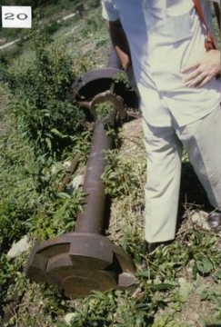 ” ‘Blizard’ sugar mill Antigua 5/79 Upright shaft (lower half) and dog clutch to upper half. [Other half of ‘dog’ was on ground beside a shack but without any shaft attached!]”. (Photograph used as an illustration in “Some Caribbean Sugar Mills”, TIMS 8, 1993).