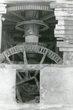 Photograph of the pit wheel, spur wheel and wallower from Woodbridge tide mill in Suffolk. This photograph was taken after the beginning of restoration work in 1972 by Peter Dolman.