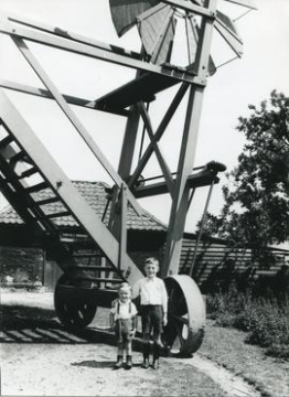 Photograph of Ralph and Derek Bryant situated in front of Upthorpe Road Mill in Stanton, photographed by Stanley Freese in 1947.