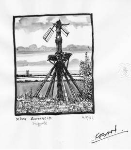 Pen and ink drawing with wash, M304 Saltworks Windpump, Southwold, 8 miles E of Halesworth, 04/08/1932