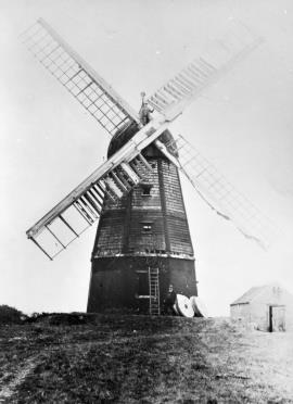 Photograph from a box of Hallam Ashley prints labelled ‘Assorted UK windmill photos – not Norfolk’. Most have no additional information. Shows a smock mill on its mound with the miller and a set of millstones.