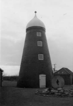 Photograph of Subscription Mill with a new cap and a millstone monument in front of the mill.