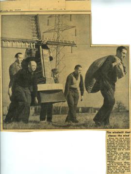 From “The Daily Mirror” – German POWs carry an agricultural model smock mill at the Dancer’s Hill POW camp. This image is used in “Mills at war”, 2019, p.43.