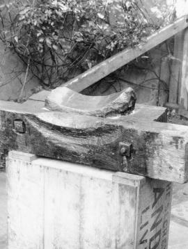 On reverse:- Stone neck bearing from Thornham Mill, Norfolk, now in the Brickwell Museum, Norwich. It is hed into the wood block by ? and plaster.
