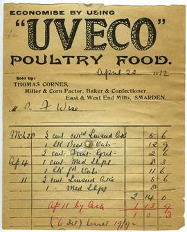 Economise by using “Uveco” Poultry Food. East and West End Mills, Smarden. Thomas Cornes, Miller, Cornfactor, Baker and Confectioner. Billhead Addressed to Mr F Wise, 22 April 1912.
