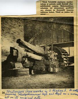 Note states: “Strömfors ironworks in south Finland. A water-powered sledgehammer left and kept as a monument on its original site”.