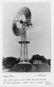 Titt wind engine, built 1898 to pump sewage at Bury Corporation Works. Gone in 1930’s. Minor remains. Copy by P Dolman. This unusual “Titt” wind engine was used to pump sewage